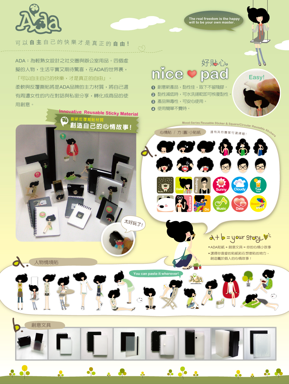 ADA;為輕熟女設計之社交圈與辦公室用品。四個虛擬的人物,生活平實又期待驚喜,在ADA的世界裏,『可以自主自己的快樂,才是真正的自由』。